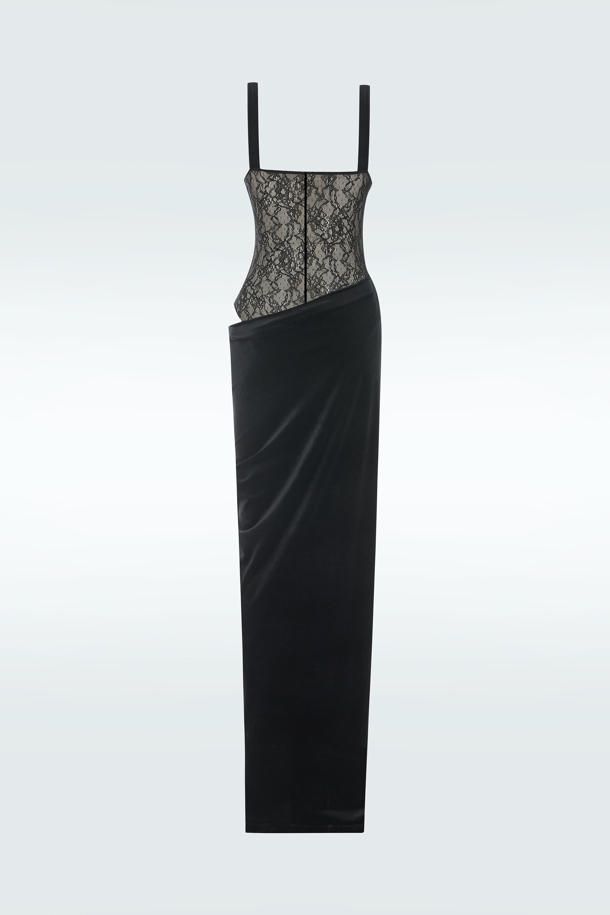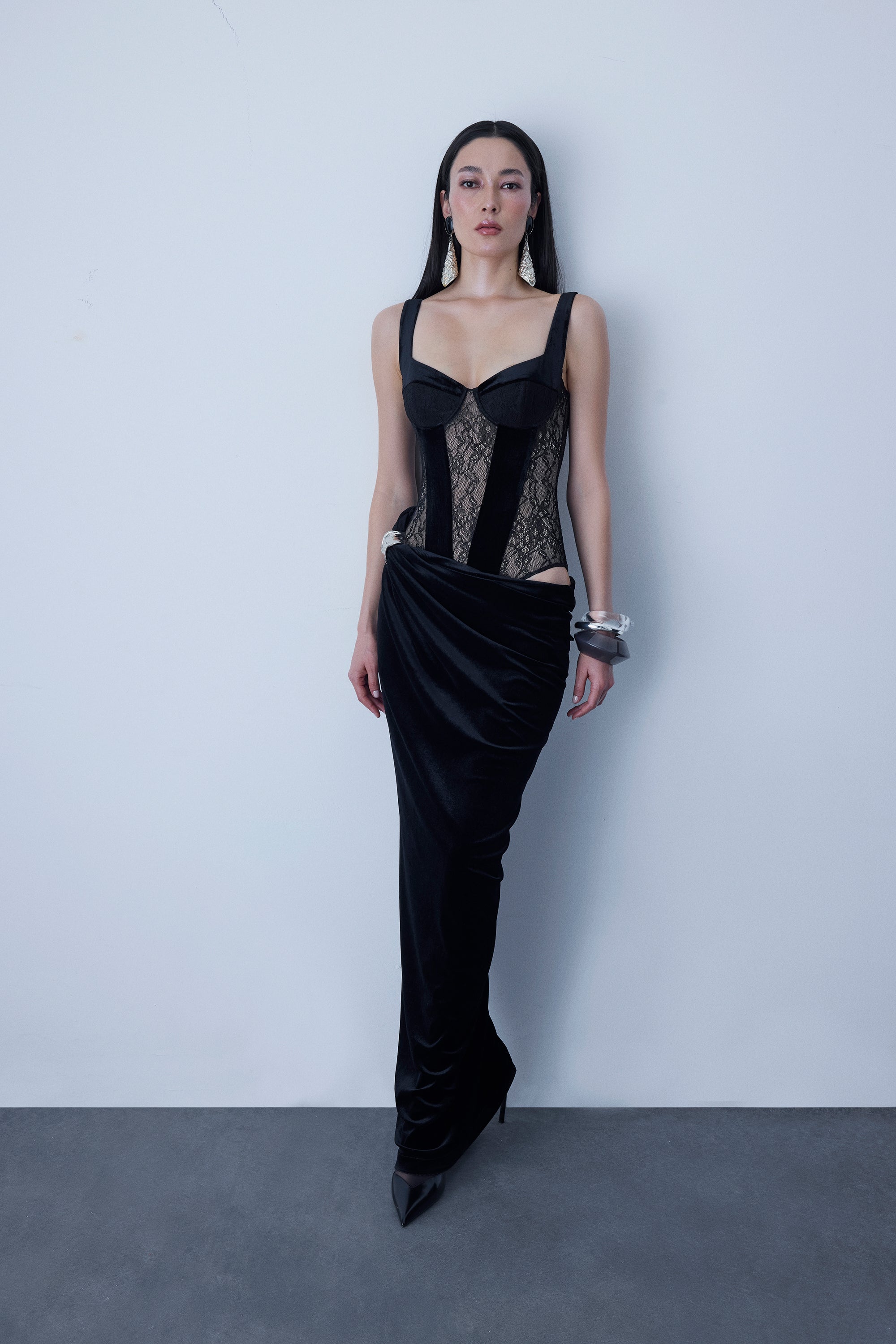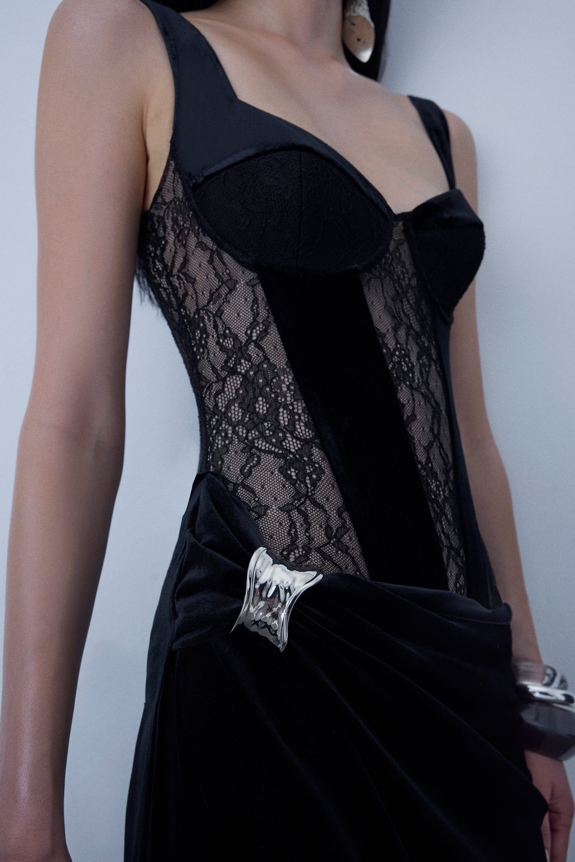 Full length lace&velvet mix dress with metal accessory