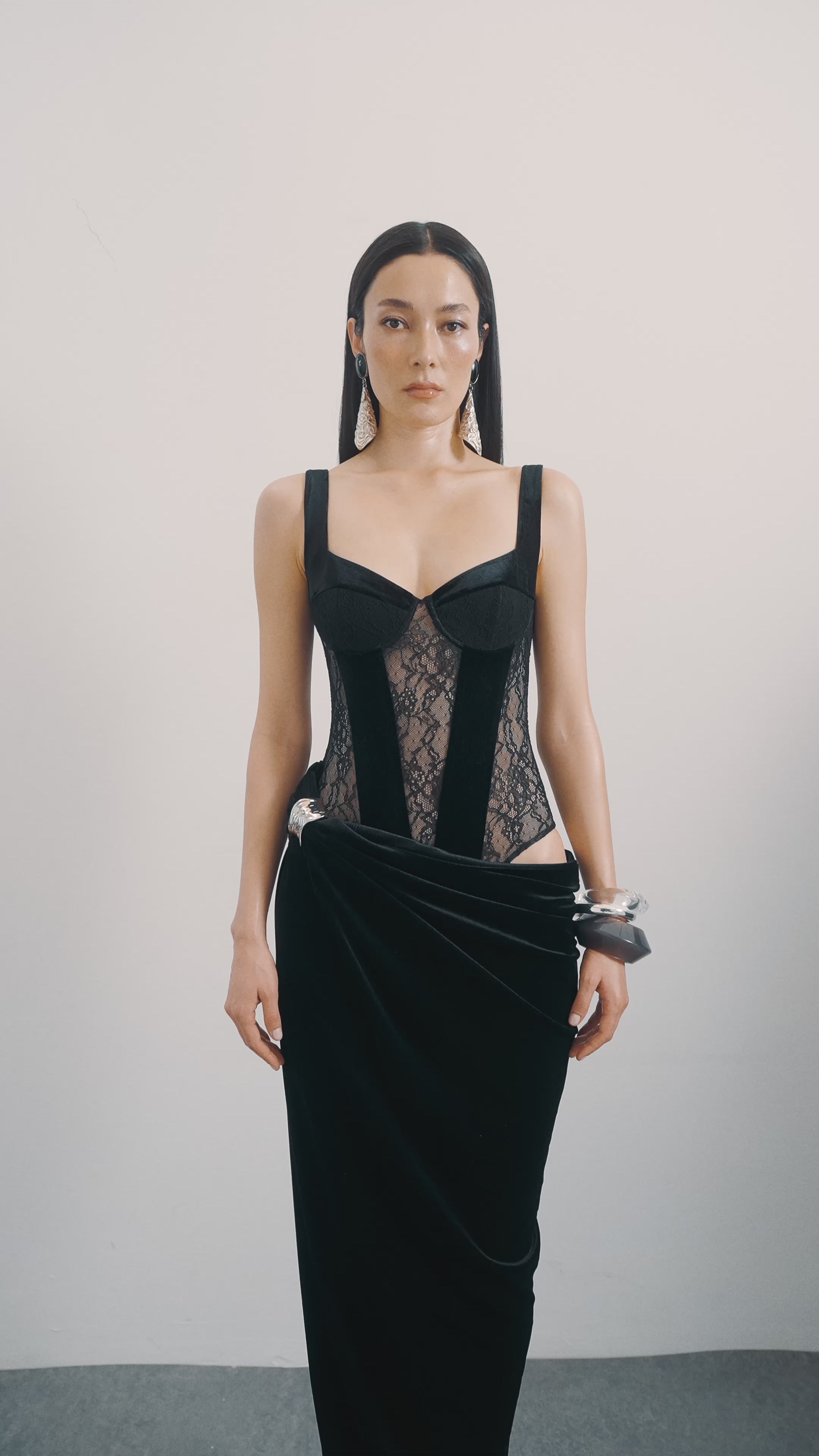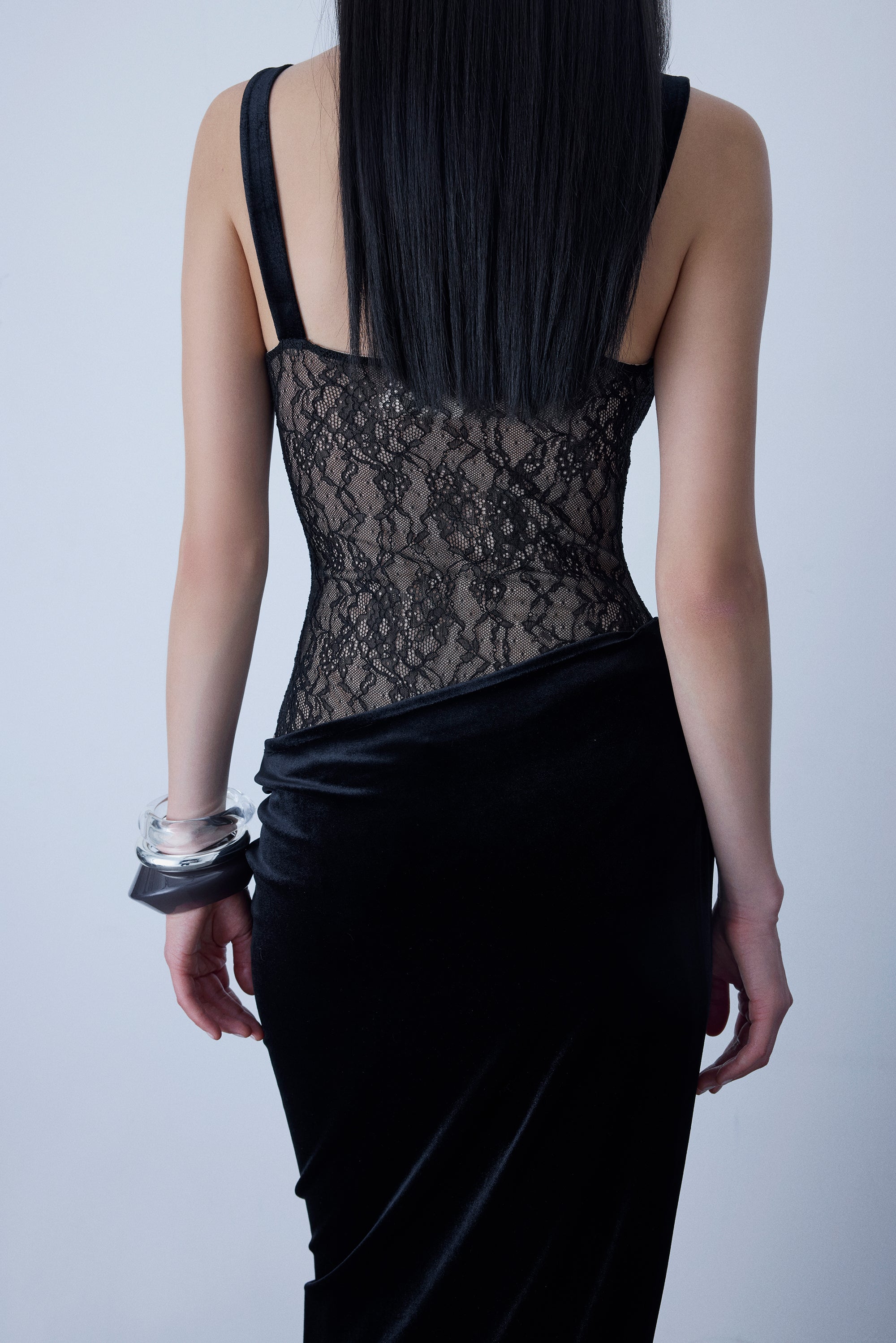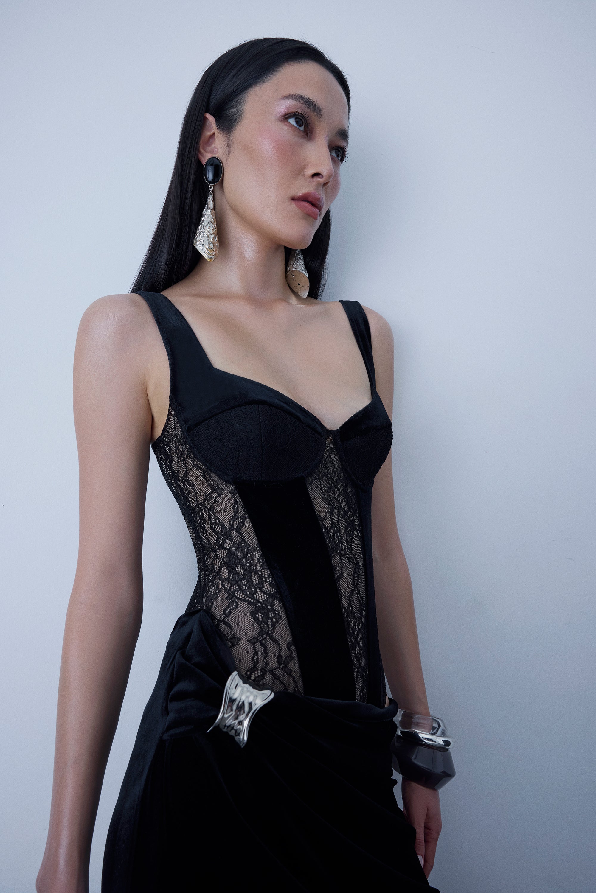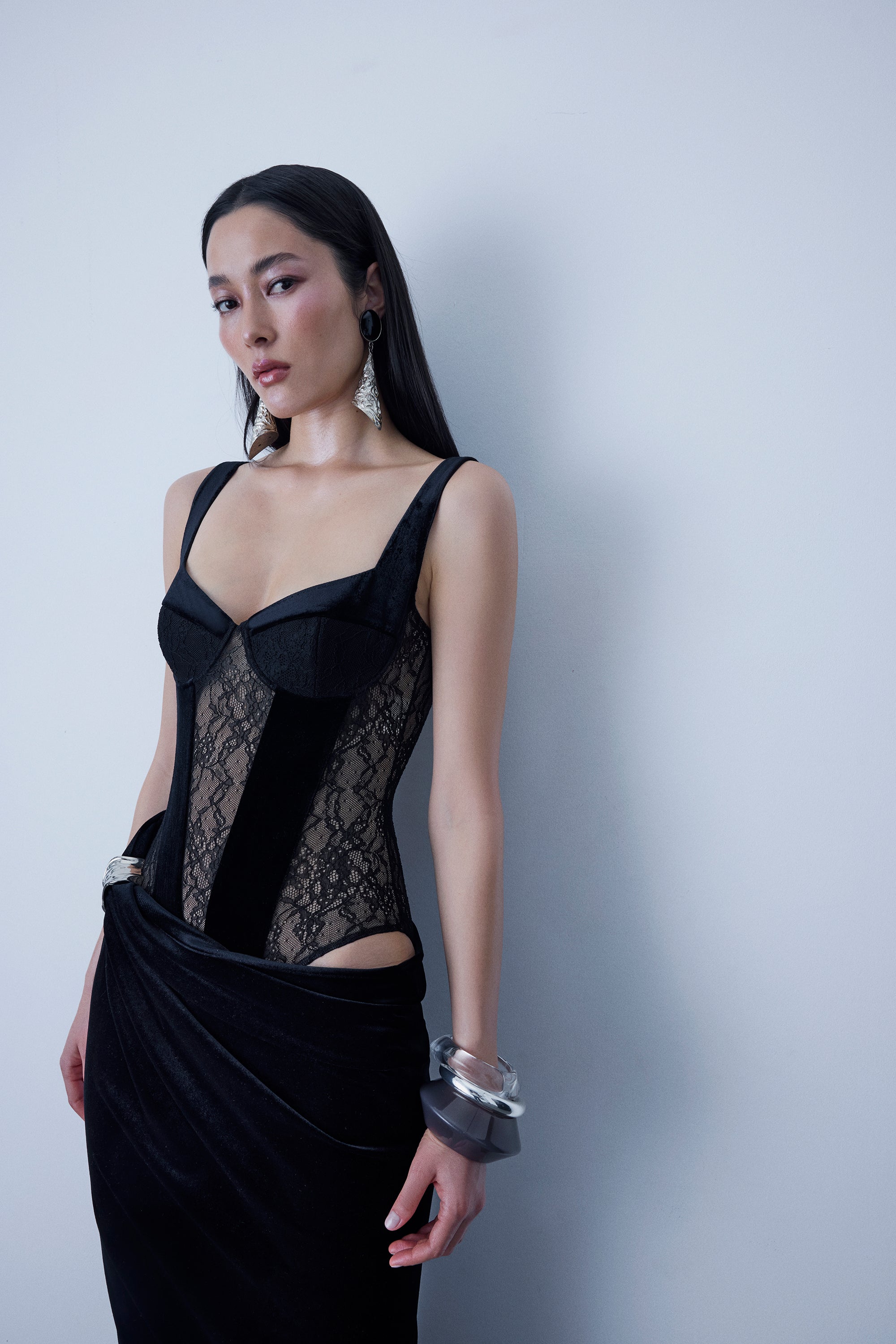 Full length lace&velvet mix dress with metal accessory