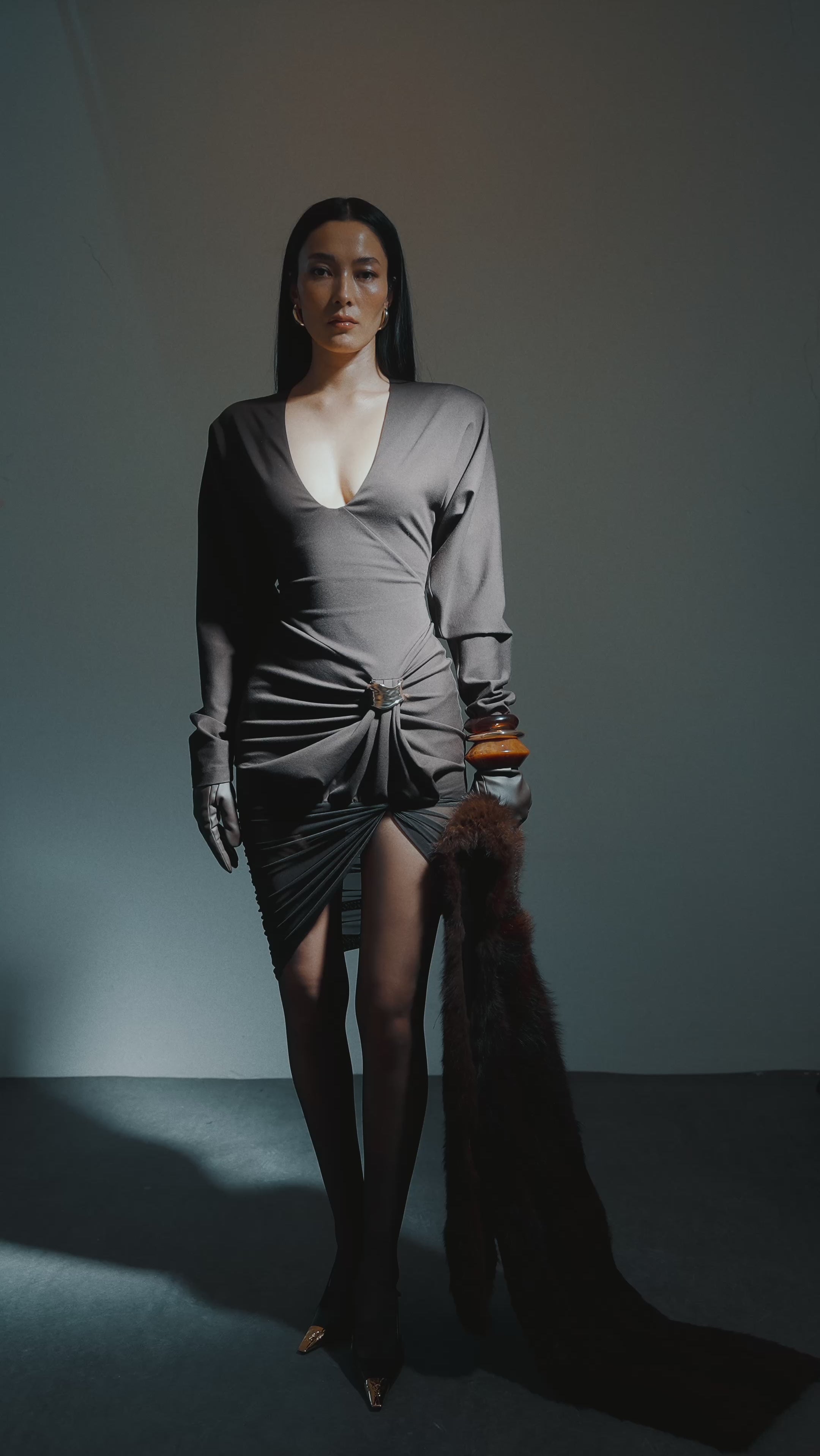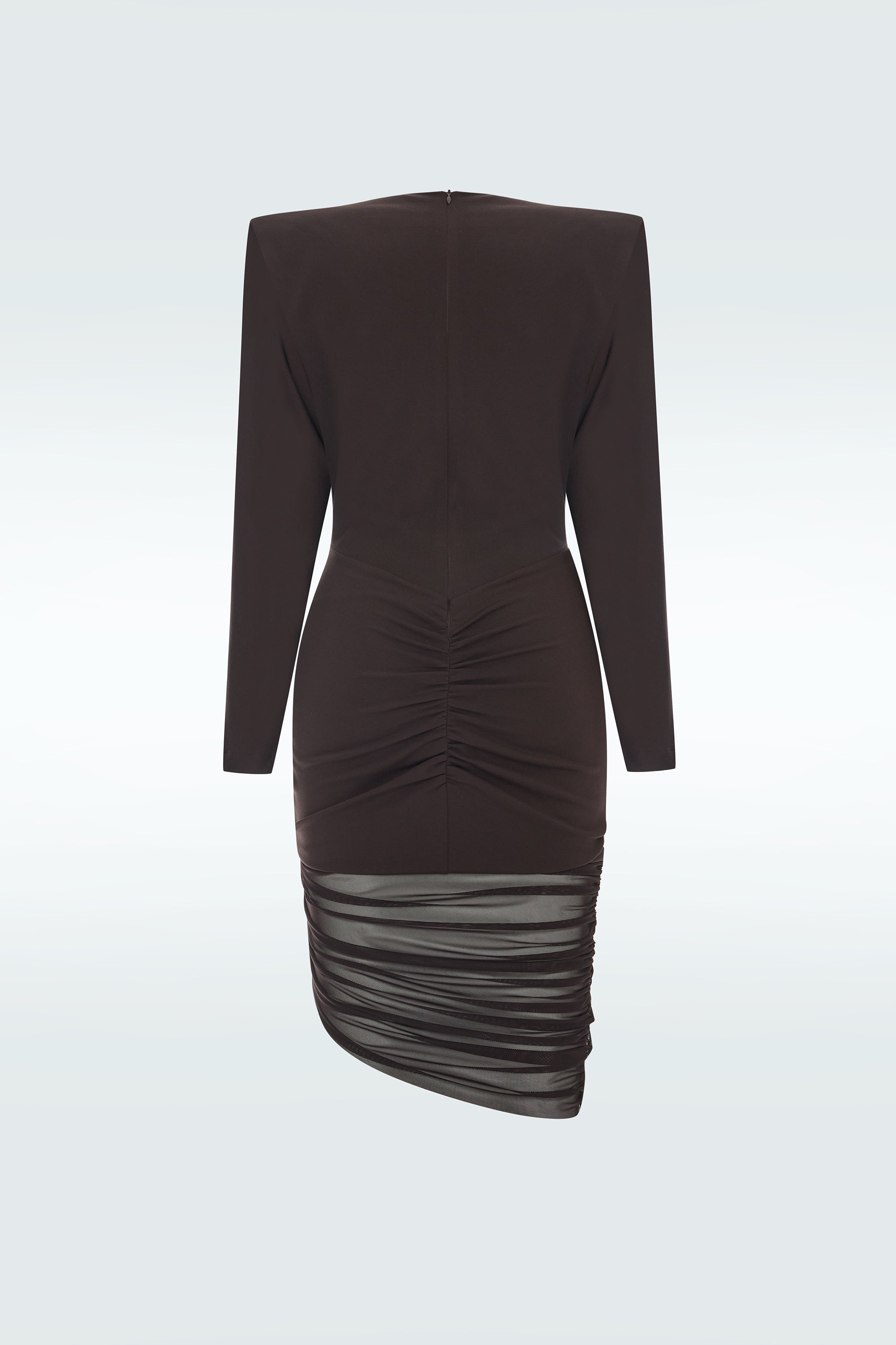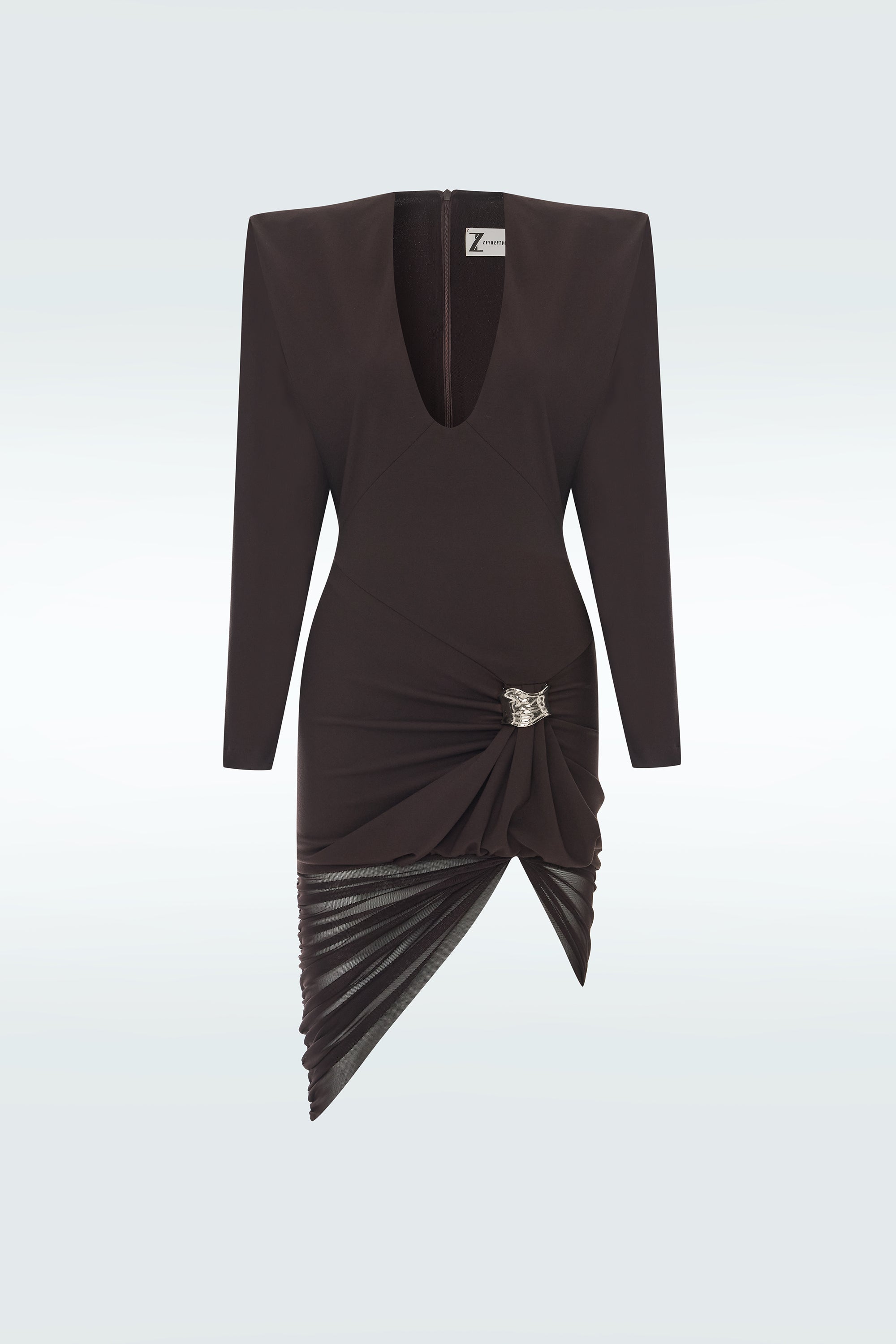 Thick soft jersey dress with metal accessory and sexy tulle draping detail