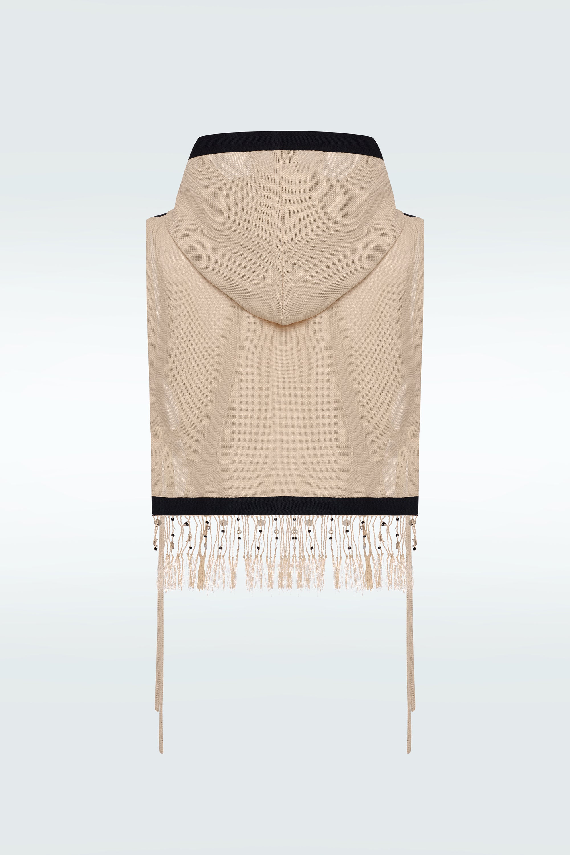 Hand embroidered mini puncho with metal sequined handmade tassels and silver thread hand embroidery on laser-cut leathers.