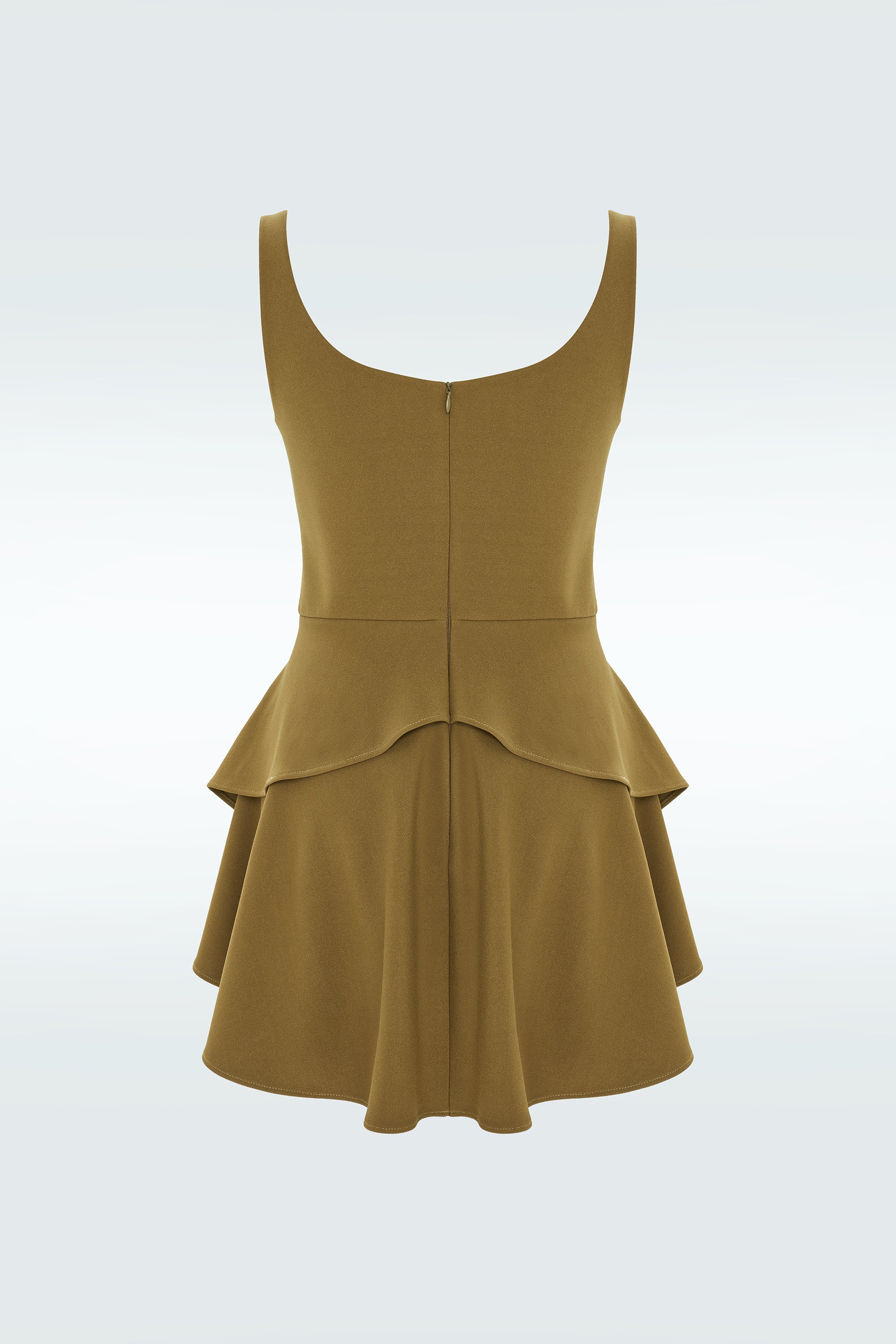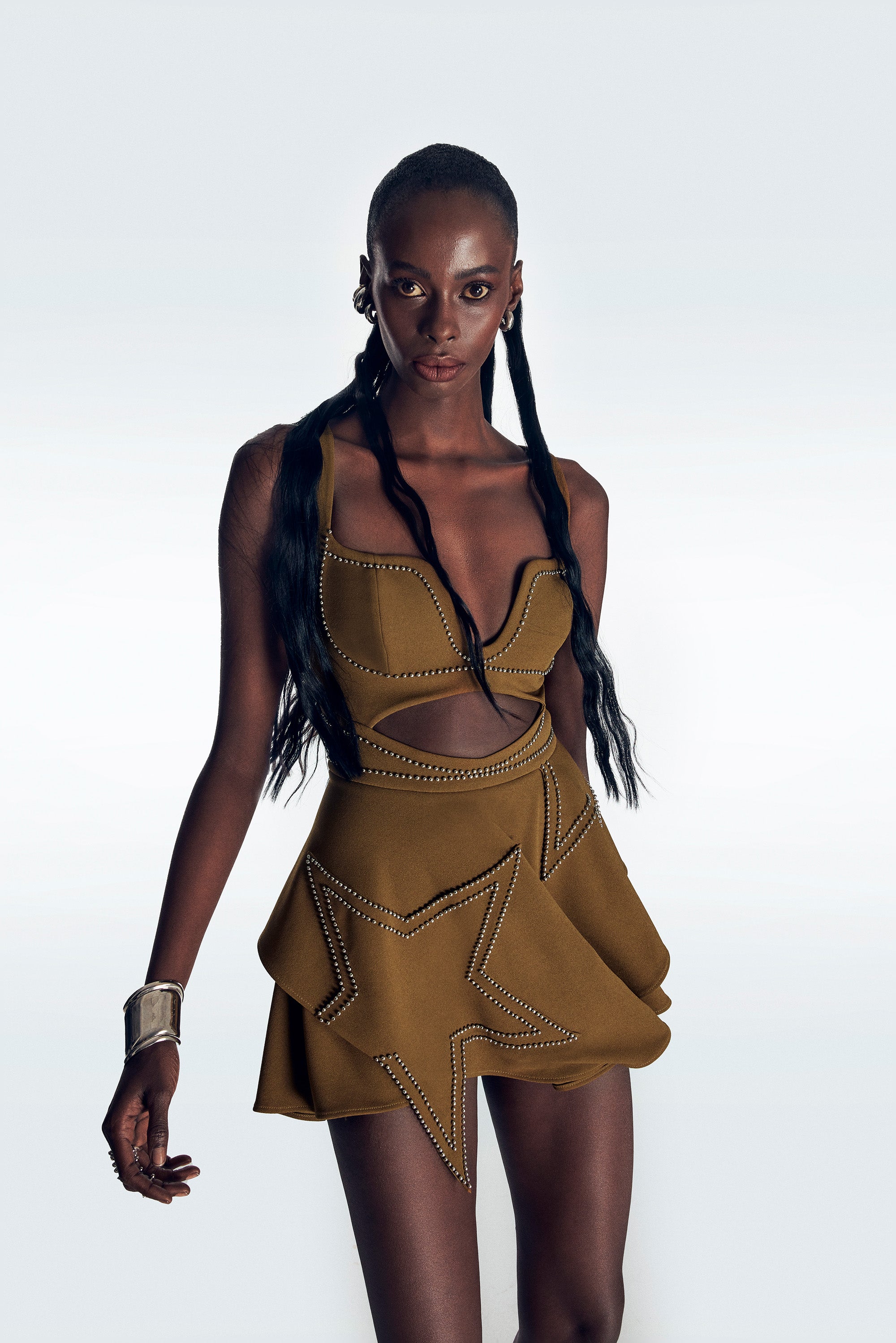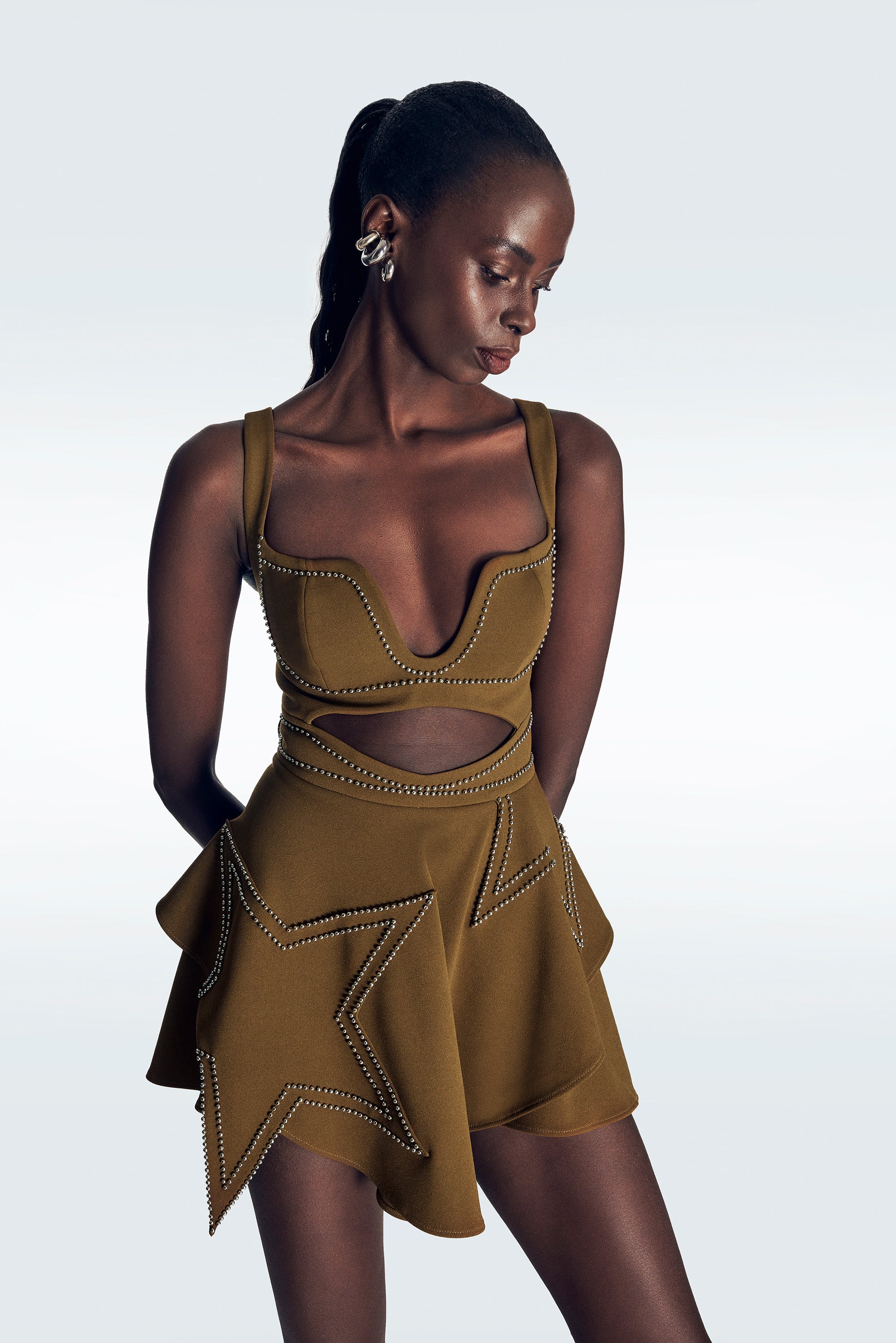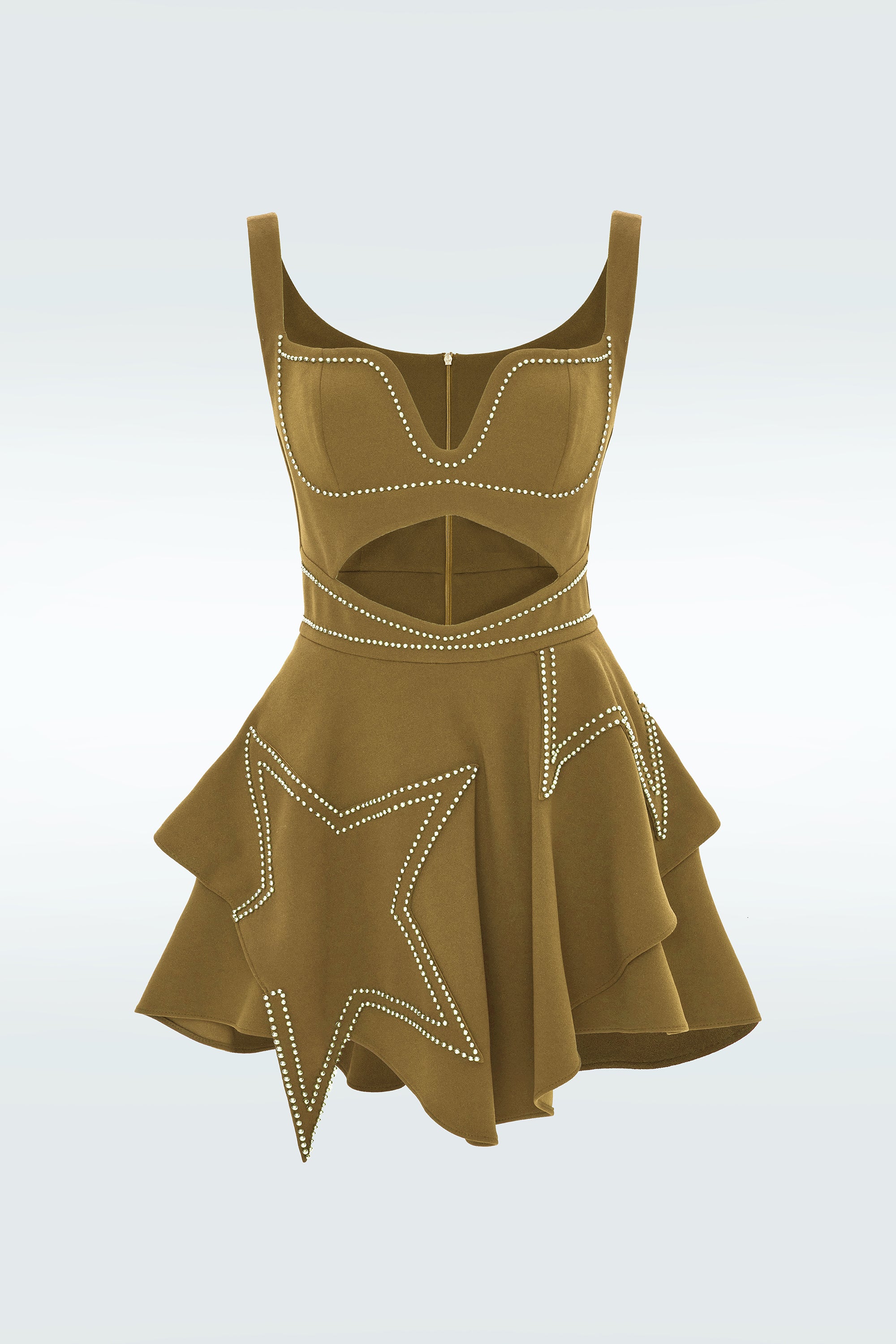 Cut-out detailed mini dress with hand embellished metallic beads.
